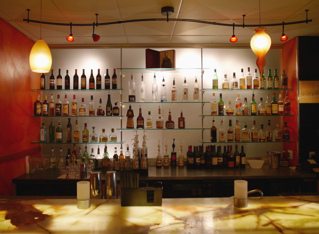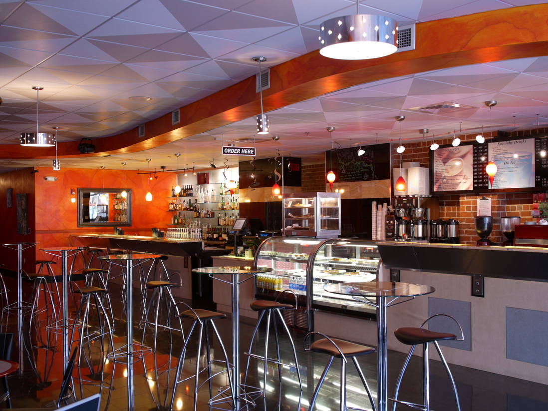 The goal was to create a fashionable cafe and casual night spot for young professionals. The cleaned load bearing brick walls act as background for strong colors, glowing onyx bar top, and backlit bar bottle display.